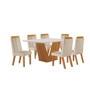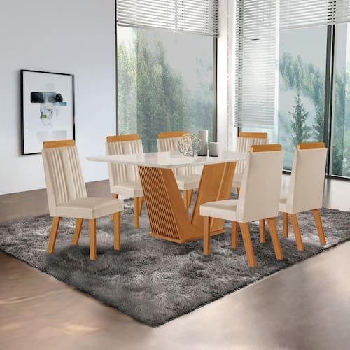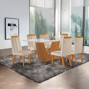 Beleza e sofisticação para sua sala de jantar! A mesa conta com tampo em vidro off-white e base em madeira ripada no elegante tom castanho cinamomo. As 6 cadeiras Florença oferecem conforto com estofado em tecido suede capuccino e detalhes em madeira no encosto, que combinam perfeitamente com os pés. Um conjunto moderno e acolhedor, ideal para reunir a família com estilo. Medida da Mesa (A x L x P): 80cmx160cmx80cm Peso da Mesa: 48,1 kg Mesa suporta até: 50 kg Acabamento da Cadeira/Banco: Pintura UV Acabamento da Mesa: Pintura UV Almofada do assento: Fixa Ambiente Principal: Sala de Jantar Cadeira/Banco estofada: Encosto e Assento Estofados Cadeira/Banco Estofada: Encosto e Assento Estofados Cadeira/Banco suporta até: 120 kg codigo_ean: 7900288210890 Complexidade da Montagem: Média: pode ser montado por mais de uma pessoa e/ou necessite de maior conhecimento para montagem Cor: Castanho Cinamomo/Creme/Off White Cor do Produto: Castanho Cinamomo/Creme/Off White Cor Secundária: Marrom De Canto (Canto Alemão): Não Design da Base: Em V Enchimento do Assento: Espuma D-20 Escala de Brilho: Semi-Fosco Espessura do Tampo: 40 mm Estrutura do Assento: MDF/MDP/Espuma Formato do Tampo: Retangular Itens Inclusos: 1 Mesa, 6 Cadeiras, Kit Ferragens e Manual de Montagem Linha ou Coleção: Florença Manual de Especificação Técnica: https://product-hub-prd.madeiramadeira.com.br/644747542/documents/99aac2f2-e046-485e-9e52-b2b12b72f3e4312186128681754567965949.pdf Manual de Montagem e Instalação: https://product-hub-prd.madeiramadeira.com.br/644747542/documents/1cd979f1-8b8c-4398-99a8-de9dd1f064633127384286817549098575226.pdf Marca: LJ Móveis Material da Base da Mesa: MDF/MDP Material da Estrutura da Cadeira: MDF/MDP Material do Tampo: Vidro/MDF Material Principal: MDP/MDF Material Principal das Cadeiras/Bancos: MDF/MDP Medida da Cadeira/Banco (A x L x P): 101cm x 43,5cm x 54cm Medida do Tampo (L x C x E): 80cmx1,60cmx2,5cm Mesa Dobrável: Não Mesa Extensível: Não Necessita Montagem: Sim Origem do Produto: Nacional Peso da Cadeira/Banco: 8,8 kg Possui Apoio para Braços: Não Possui Apoio Para os Pés: Não Possui Vidro: Sim Quantidade de Cadeiras: 6 Quantidade de Lugares: 06 Recomendações de Uso, Manutenção e Limpeza: Pano úmido. Não utilizar produtos de limpeza Revestimento da Cadeira/Banco: Suede Sistema de Montagem: Cavilhas, Parafusos e Cantoneiras. Tipo de Assento: Fixo Tipo de Encosto: Fixo