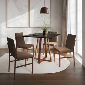 Conjunto de Jantar Mesa Mônaco 90cm Tampo Preto com 4 Cadeiras Marrom Base Cobre