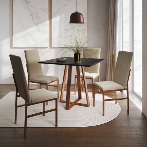 Com um design sofisticado e contemporâneo, este conjunto é perfeito para transformar suas refeições em momentos especiais. A mesa espaçosa oferece espaço suficiente para acomodar sua família e convidados, enquanto as cadeiras estofadas proporcionam conforto excepcional durante as refeições. Seja para jantares formais ou encontros casuais, nosso conjunto de mesa e cadeiras é a escolha perfeita para adicionar estilo e funcionalidade à sua sala de jantar.Tipo: ConjuntoModelo: MônacoTecido Cadeira: VeludoCor Estofado: Bege Cor Base Cadeira: Cobre Cor Tampo Mesa: Preto Cor Base Mesa: CobreMedidas Cadeira:Altura: 95cmLargura: 41cmComprimento: 50cmMedidas Mesa:Altura: 76cmLargura: 90cmComprimento: 90cmATENÇÃOIMAGENS MERAMENTE ILUSTRATIVAS REALIZADO EDIÇÃO, PODENDO HAVER UMA PEQUENA VARIAÇÃO DE COR DEPENDENDO DE CADA TELA OU MONITOR.