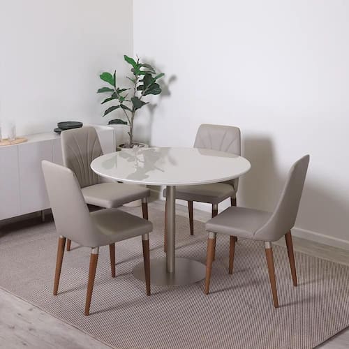 Mesa de Jantar Redonda com Vidro para 4 Lugares Cloe 108 cm - Off White Fosco Tampo em MDF usinado de 20 mm, com borda arredondada e acabamento em pintura PU . Vidro de 3 mm aplicado sobre o tampo com acabamento em pintura UV. Base em aço carbono com pintura eletrostática e protetor de silicone anti-impacto. Indicado para ambientes internos. Ideal para 4 lugares. Peso Suportado no tampo: 30 kg. Largura: 108 cm Altura: 78 cm Profundidade: 108 cm Peso: 35.08 kg