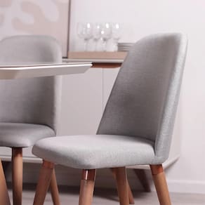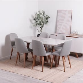 Madeira maciça | MDF | Vidro | LinhoEspecificações: Conjunto composto por 1 Mesa de Jantar e 6 Cadeiras.