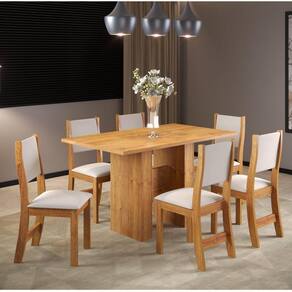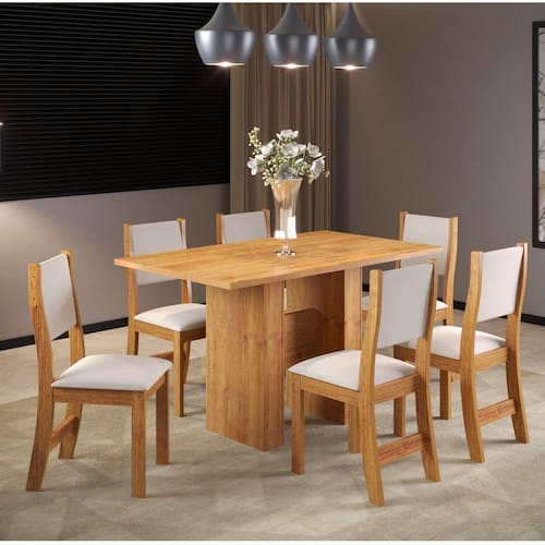 O Conjunto de Jantar Piemonte chegou para fazer parte de um dos cantinhos mais queridos da casa. Ele estará presente no dia a dia da sua família, naqueles momentos especiais das refeições. O conjunto é super versátil, podendo ser utilizado tanto na sala de jantar quanto na cozinha. Medida da Mesa (A x L x P): 78,5x136x80cm Peso da Mesa: 27,9 kg Mesa suporta até: 50.0000 Acabamento da Cadeira/Banco: Pintura UV Acabamento da Mesa: Pintura UV Altura do Conjunto: 78.5 Ambiente Principal: Sala de Jantar Cadeira/Banco Estofada: Encosto e Assento Estofados Cadeira/Banco estofada: Encosto e Assento Estofados Cadeira/Banco suporta até: 80.0000 codigo_ean: 7909903468067 Complexidade da Montagem: Baixa: pode ser montado por uma pessoa sozinha Cor: Mel/Marfim Cor do Produto: Mel/Marfim De Canto (Canto Alemão): Não Enchimento do Assento: Espuma D-16 Enchimento do Encosto: Espuma D-12 Escala de Brilho: Semi-Brilho Espessura do Tampo: 25 mm Estrutura do Assento: MDP/Espuma Estrutura do Encosto: MDP/Espuma Formato do Tampo: Retangular Informações Complementares: Sala de Jantar 6 Lugares Itens Inclusos: 1 Mesa, 6 Cadeiras, Manual de Montagem e Kit Ferragens Manual de Montagem e Instalação: https://product-hub-prd.madeiramadeira.com.br/874643/documents/3b07b02b-c866-476c-a55b-53075be3254enualdemontagemsalapiemonte.pdf Material da Base da Mesa: MDF/MDP Material da Estrutura da Cadeira: MDF/MDP Material do Tampo: MDP Material Principal: MDF/MDP Material Principal das Cadeiras/Bancos: MDF/MDP Medida da Cadeira/Banco (A x L x P): 89x38,7x51,5cm Medida do Tampo (L x C x E): 136x80x2,5cm Mesa Extensível: Não Necessita Montagem: Sim Origem do Produto: Nacional Peso da Cadeira/Banco: 5,9 kg Possui Apoio Para os Pés: Não Possui Prateleiras: Não Possui Vidro: Não Quantidade de Cadeiras: 6 Quantidade de Lugares: 06 Recomendações de Uso, Manutenção e Limpeza: Limpar com pano levemente umedecido com água Revestimento da Cadeira/Banco: Veludo Sistema de Montagem: Parafusos, cavilhas Tipo de Assento: Fixo Tipo de Encosto: Fixo Ean: 7909903468067