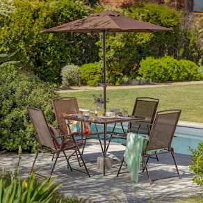 O conjunto e composto por quatro cadeiras, uma mesa de vidro retangular e um ombrelone, todos projetados para resistir ao uso diario. As cadeiras e o ombrelone sao feitos de TEXTILENO, um material resistente que suporta ate 100 kg, enquanto a mesa possui um tampo de vidro duravel e uma estrutura de aco. O design compacto e leve do conjunto facilita a movimentacao e o reajuste conforme necessario, tornando-o ideal para espacos pequenos e grandes.
