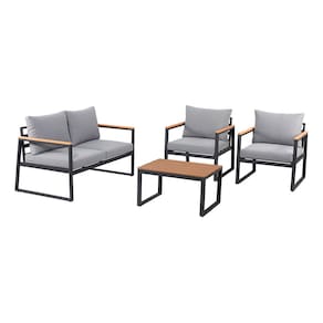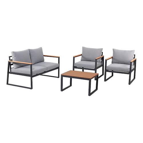 O conjunto inclui um sofa espacoso para quatro pessoas, uma poltrona confortavel e uma mesa retangular com tampo de fibra, perfeita para apoiar bebidas e petiscos. Cada peca e meticulosamente projetada para proporcionar o maximo de conforto e praticidade. O sofa e a poltrona possuem assentos e encostos em fibra sintetica e poliester, oferecendo uma experiencia de assento agradavel e ergonomica. A estrutura em aco pintado assegura estabilidade e resistencia, enquanto o acabamento em cinza elegante complementa qualquer decoracao externa.