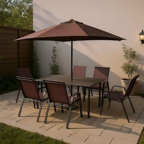Transforme seu espaco ao ar livre em um verdadeiro oasis de conforto e estilo com o Conjunto de Moveis para Jardim Capitolio. Este conjunto, composto por 9 pecas, oferece tudo o que voce precisa para criar uma area de estar elegante e funcional. Composto por uma mesa retangular, seis cadeiras e um ombrelone, e a escolha perfeita para receber amigos e familiares em momentos de descontracao ao ar livre. Fabricado em aco de alta qualidade, o conjunto e resistente e duravel, ideal para areas externas. A mesa, com dimensoes de 150x90x71cm, possui um tampo de metal robusto e um furo central para acomodar o ombrelone, garantindo sombra e frescor durante os dias ensolarados. As cadeiras, com estrutura tambem em aco e assentos em tecido textilene, medem 92x73x55cm, proporcionando conforto e suporte adequados para longas horas de uso. O ombrelone, com uma cobertura em tecido e estrutura metalica, mede 200x200x220cm e inclui uma base para facilitar sua fixacao, oferecendo protecao contra o sol e criando um ambiente agradavel. Este conjunto e projetado para areas externas, com um estilo atemporal que combina com qualquer decoracao de jardim. Embora o produto nao seja indicado para regioes com maresia ou contato direto com agua, sua montagem e simples e pode ser realizada por uma pessoa leiga, gracas ao manual de instrucoes incluso. Alem disso, o conjunto oferece uma garantia de 03 meses contra eventuais defeitos de fabricacao. Se busca um mobiliario que alie funcionalidade e design sofisticado, o Conjunto de Moveis para Jardim Capitolio e a escolha ideal para transformar sua area externa em um espaco de convivencia elegante e acolhedor. Produto: Conjunto de Moveis para Jardim Tipo de Conjunto: Mesa, Cadeira e Ombrelone Colecao Jardim: Capitolio Marca: Importado Tipo de Material: Aco Cor: Marrom Tonalidade: Marrom Quantidade de Lugares: 6 lugar(es) Uso Indicado do Movel: Para Estar Areas Indicadas: Externas Estilo: Atemporal Quantidade de Pecas: 9 peca(s) Acompanha Mesa: com Mesa Material do Tampo da Mesa: Metal Tipo de Material do Tampo da Mesa: Aco Material da Estrutura da Mesa: Metal Tipo de Material da Estrutura da Mesa: Aco Cor da Mesa: Marrom Tonalidade da Mesa: Marrom Mesa Dobravel: Nao Furo para Ombrelone: Sim Dimensao da Mesa (AxLxC): 150x90x71cm Formato da Mesa: Retangular Acompanha Banqueta: sem Banqueta Acompanha Cadeira: com Cadeira Material do Assento da Cadeira: Tecido Tipo de Material do Assento da Cadeira: Textilene Material da Estrutura da Cadeira: Metal Tipo de Material da Estrutura da Cadeira: Aco Material da Encosto da Cadeira: Tecido Tipo de Material da Encosto da Cadeira: Textilene Cadeira Dobravel: Nao Dimensao da Cadeira (AxLxP): 92x73x55cm Acompanha Sofa: sem Sofa Acompanha Ombrelone: com Ombrelone Material da Cob Marca: Não Informado Ean: 3267078965786
