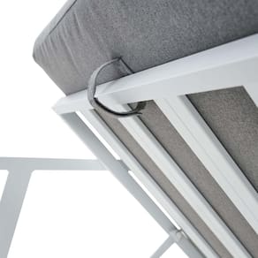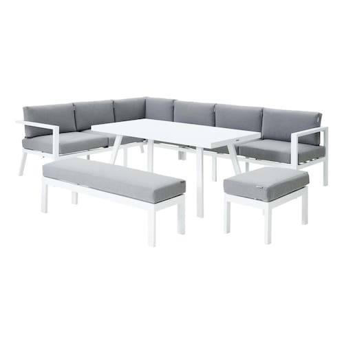 Caracteristicas principais: Conjunto de Moveis para Jardim, inclui sofa, banco e mesa. Colecao Naxos da Naterial. Feito de aluminio e poliester. Cor: Branco e Cinza. Capacidade para 10 pessoas. Ideal para areas externas cobertas, secas e umidas. Estilo contemporaneo. Mesa retangular de aluminio, dimensoes: 84,5x68x150 cm. Banco para 3 pessoas, dimensoes: 40x130x42 cm. Sofa para 3 pessoas, dimensoes: 75x212x77 cm. Nao enferruja, alta durabilidade e facil de montar. Garantia de 2 anos."