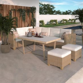 "Transforme seu espaco externo em um verdadeiro oasis de conforto e estilo com o Conjunto de Moveis para Jardim Medena da Naterial. Este conjunto sofisticado, composto por 5 pecas, oferece um equilibrio perfeito entre design moderno e funcionalidade. Composto por um sofa espacoso e uma mesa retangular com tampo de vidro temperado, ele e ideal para refeicoes ao ar livre, proporcionando um ambiente acolhedor e elegante para ate 7 pessoas.