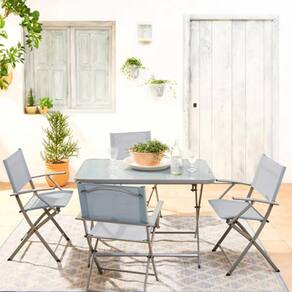 Produto: Conjunto para Jardim (Mesa com Cadeiras) Coleção Jardim: Emys Marca: Naterial Tipo de Material: Aço Cor: Cinza Tonalidade: Cinza Quantidade de Lugares: 4 lugares Uso Indicado do Móvel: Para Refeição Áreas Indicadas: Externas com Cobertura, Secas Estilo: Contemporâneo Modelo: Emys Quantidade de Peças: 5 peças (1 mesa e 4 cadeiras) Mesa: Dobrável, sem furo para ombrelone, dimensões 74x70x110 cm Cadeira: Dobrável, com assento em tecido e estrutura metálica, dimensões 86x55x57 cm cada Montagem: Desmontado Garantia do Fabricante: 1 ano"