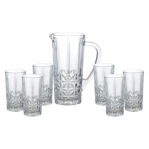 O conjunto é composto por sete peças, sendo 1 jarra de 1 litro de capacidade e 6 copos com 270 ml de capacidade cada. O conjunto é perfeito para servir sua família ou seus convidados com muito estilo e sofisticação!