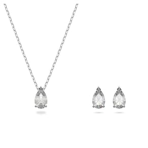 SWAROVSKI Coleção de conjunto de joias Atrair, cristais azuis, cristais transparentes, Metal não precioso, Zircônia cúbica - Comprimento do colar: 36 cm Comprimento do brinco: 9,5 cm - Atemporal e elegante: Com um colar de pingente adornado com um único cristal branco em forma de gota e um par de brincos perfurados brilhantes, certamente vai chamar corações e chamar a atenção - Precisão e arte: Conjunto com cristais meticulosamente cortados em forma de gota que refratam a luz da maneira que apenas os cristais Swarovski podem, para um básico clássico que celebra a individualidade - Projetado para durar: as joias Swarovski mantêm seu brilho quando práticas de cuidado simples são observadas; remova antes de entrar em contato com água, loções ou perfumes e polir com um pano sem fiapos - Quebre as regras de estilo: inovação encontra inspiração com este conjunto de joias hipnotizante, tornando-o uma adição icônica a qualquer roupa ou coleção, ou como um presente para aquela pessoa especial - Itens entregues: (1) Colar Swarovski Stilla Atrair, comprimento 36 cm, (1) brincos Swarovski Stilla Atrair, comprimento 9,5 cm, com cristais transparentes em acabamento de ródio, com caixa de joias Swarovski