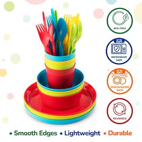 Finalmente, há um conjunto completo de louças para crianças que é inquebrável, reutilizável, seguro para micro-ondas e lava-louças.