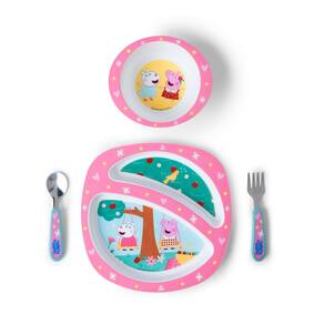 - Conjunto de refeição infantil de 4 peças: este alegre conjunto de alimentação da Peppa Pig inclui uma tigela infantil, prato dividido e garfo e colher de aço inoxidável para tornar a hora da refeição divertida para o seu pequeno