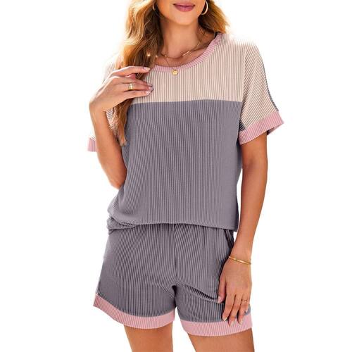 Dokotoo Conjunto feminino de 2 peças de roupa loungewear de manga curta com cintura elástica e shorts canelados, Cinza, rosa