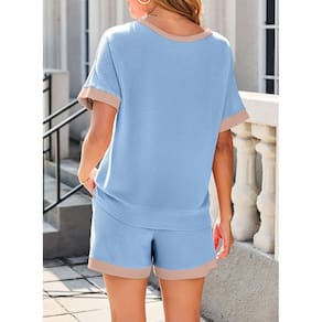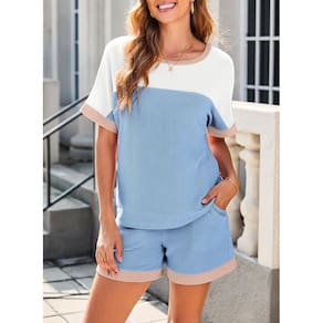 - Características: Roupas femininas Dokotoo de 2 peças, conjuntos combinando com lounge, tops e shorts de manga curta com gola redonda e cor block.