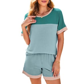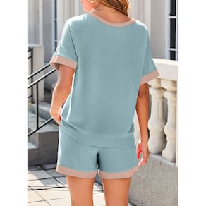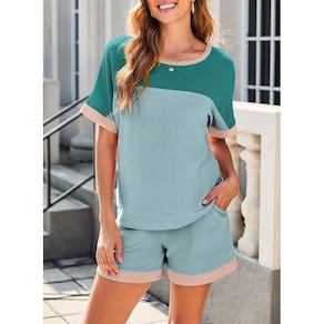 - Características: Roupas femininas Dokotoo de 2 peças, conjuntos combinando com lounge, tops e shorts de manga curta com gola redonda e cor block.