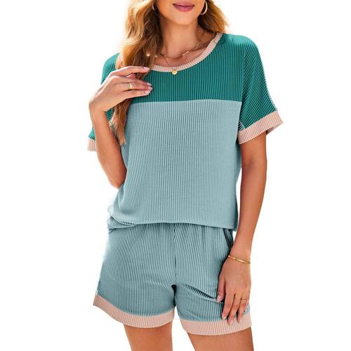 Dokotoo Conjunto feminino de 2 peças de manga curta e shorts com cintura elástica canelada, Verde