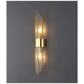 As hastes de vidro transparente podem ser ajustadas conforme suas necessidades, oferecendo maior flexibilidade na instalação. O suporte de parede é feito de aço inoxidável soldado e vidro cristal, com um design texturizado em metal dourado que exala brilho e elegância.