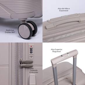 Cada mala possui cadeado embutido com senha, 4 rodas duplas 360 para mobilidade suave, além de alça superior e lateral e pés de apoio que tornam o manuseio mais confortável e estável.