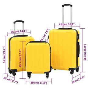 - Cor: amarelo - - Material: ABS com forro de tecido - - Tamanho (S): 17,9" x 11,8" x 7,9" (C x L x A) - - Tamanho (M): 21,7" x 14,2" x 8,7" (C x L x A) - - Tamanho (L): 26" x 16,1" x 9,4" (C x L x A) - - Comprimento da alça a partir do chão (total estendido): 37" (S), 42,5" (M), 42,7" (L) - - Alças tensoras internas - - Trava de segurança - - Quatro rodízios de 360 graus - - Podem ser guardados dentro dos maiores - - A entrega inclui 3 carrinhos em tamanhos diferentes - - Proposta 65 da Califórnia