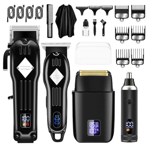 - Conjunto de cuidados masculinos: o conjunto de cortadores de barbeiro profissional inclui cortador de cabelo, aparador de cabelo, barbeador elétrico, cortador de pelos do nariz, 6 pentes guia de cortador de cabelo (1,5/3/4,5/6/9/12 mm), pente guia aparador de 3 detalhes (1/2/3 mm), pano redondo, escova de limpeza *2, cabo usb *4, pente e uma garrafa de óleo