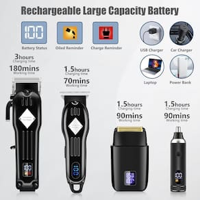 - Bateria de grande capacidade: o aparador de cabelo masculino pode ser utilizado por 180 minutos com uma única carga. O aparador T-Shaper pode ser utilizado por 70 minutos com uma única carga. O barbeador de alumínio pode ser utilizado por 90 minutos com uma única carga. O aparador de pelos do nariz pode ser utilizado por 90 minutos com uma única carga. A luz LED mostra a energia restante da bateria, o status de carregamento e o lembra prontamente de carregar. O carregamento USB está disponível a qualquer hora, em qualquer lugar