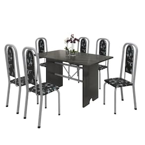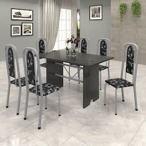 Conjunto de Mesa 140x75cm Tampo Ardósia com 6 Cadeiras Lavínea Soma Móveis Martelado Pérola/Preto Floral