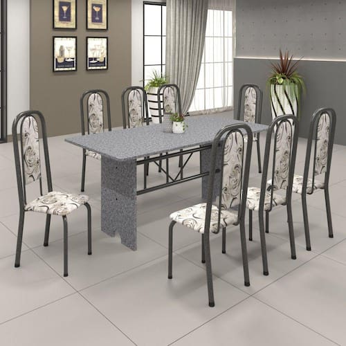 Quer deixar sua casa completa com um toque especial? Uma dica bacana de como transformar sua cozinha, deixando-a mais receptiva e bonita? Então você precisa de móveis indispensáveis para deixar seu lar muito mais aconchegante, receptivo e sempre disponível para receber a visita de amigos, familiares e convidados. Você vai se apaixonar por este incrível Conjunto de Mesa com 8 Cadeiras Lavínea. Ideal para cozinha, ele é a marromhor opção para completar o espaço. Aproveite!! Acabamento da Cadeira/Banco: Pintura Texturizada Acabamento da Mesa: Acetinado Almofada do assento: Fixa Altura do Conjunto: Ambiente Principal: Cozinha Apoio para Braços Estofado: Cadeira/Banco estofada: Sim Cadeira/Banco suporta até: 120 Complexidade da Montagem: Baixa: pode ser montado por uma pessoa sozinha Cor: Martelado Prata/Ocre/Arabesco Cor do Produto: Martelado Prata/Ocre/Arabesco Enchimento do Assento: Espuma D-16 Enchimento do Encosto: Escala de Brilho: Semi-Brilho Espessura do Tampo: 15 Estrutura do Assento: MDP 15mm Estrutura do Encosto: Informações Complementares: Itens Inclusos: 1 Mesa, 8 Cadeiras, Kit Ferragens e Manual de Montagem Linha ou Coleção: Lavinea Manual de Especificação Técnica: Manual de Montagem e Instalação: https://cdn2.madeiramadeira.com.br/atributo/soma-moveis-ltda/1157912-lavinea.pdf Material da Base da Mesa: Granito Material da Estrutura da Cadeira: Aço Medida da Base (A x L x P): Medida da Cadeira/Banco (A x L x P): 108x37x40cm Medida da Mesa (A x L x P): 75x75x180cm Medida do Canto Alemão (A x L x P): Medida do Suporte Giratório (L x C x E): Medida do Tampo (L x C x E): 180x75x1,5cm Mesa suporta até: 10 Necessita Montagem: Sim Origem do Produto: Nacional Peso da Cadeira/Banco: 3.82 Peso da Mesa: 105.06 Possui Apoio para Braços: Não Possui Apoio Para os Pés: Não Possui Suporte Giratório: Não Recomendações de Uso, Manutenção e Limpeza: Não permitir que molhe os pés da base, usar um pano de tecido macio e seco, evitar detergentes, alvejantes e produtos químicos de limpeza; no tampo usar tecido macio levemente umedecido. Revestimento da Cadeira/Banco: Couro Ecológico Sistema de Montagem: PARAFUSOS Tipo de Madeira Maciça da Base da Mesa: Tipo de Madeira Maciça do Tampo: Vidro Temperado: