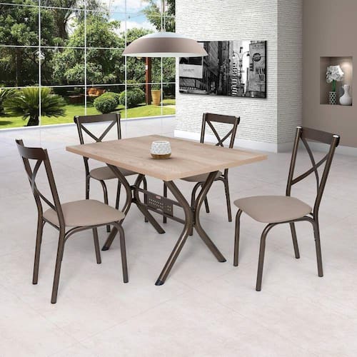 O Conjunto de Mesa e Cadeiras Karina, possui um designer moderno, que vai deixar a sua cozinha ainda mais bonita. com tampo de BP Carvalho Montreal de 1,20m x 0,80m, possui textura em 3D (que imita a madeira marroml) , mais leve permitindo a movimentação para limpeza do piso e revestimento dupla face. Suas 4 Cadeiras possuem assento anatômico e sistema de fixação com porca agarras, que proporcionam maior conforto e comodidade. Além disso suas ponteiras de proteção interna nos pés, que garante maior proteção contra riscos e ferrugem. Medida da Mesa (A x L x P): 76cm x 80cm x 120cm Peso da Mesa: 16 kg Mesa suporta até: 10.0000 Acabamento da Cadeira/Banco: Pintura Epóxi Acabamento da Mesa: Pintura Epóxi Almofada do assento: Removível Altura do Conjunto: 75 cm Ambiente Principal: Sala de Jantar Cadeira/Banco estofada: Sim Cadeira/Banco suporta até: 100.0000 codigo_ean: 7898148439126 Complexidade da Montagem: Baixa: pode ser montado por uma pessoa sozinha Cor: Bronze/Linho Bege Cor do Produto: Bronze/Linho Bege Enchimento do Assento: Espuma D-14 Escala de Brilho: Semi-Brilho Espessura do Tampo: 30 mm Estrutura do Assento: Pinus Compensado/Espuma Estrutura do Encosto: Aço Formato do Tampo: Retangular Itens Inclusos: 1 Base de Mesa, 1 Tampo, 4 Cadeiras, Kit de Montagem e Manual de Montagem Linha ou Coleção: Karina Manual de Montagem e Instalação: https://product-hub-prd.madeiramadeira.com.br/567596/documents/4c24c790-62ca-46f8-97db-1af13a8f4d8c9eea1f13520722manual276108.pdf Material da Base da Mesa: Aço Material da Estrutura da Cadeira: Aço Material do Tampo: MDF/MDP Medida da Base (A x L x P): 74cm x 59cm x 75cm Medida da Cadeira/Banco (A x L x P): 91,5cm x 45,5cm x 51cm Medida do Tampo (L x C x E): 80cm x 120cm x 30mm Necessita Montagem: Não Origem do Produto: Nacional Peso da Cadeira/Banco: 4 kg Possui Apoio para Braços: Não Possui Apoio Para os Pés: Não Possui Suporte Giratório: Não Quantidade de Cadeiras: 4 Quantidade de Lugares: 04 Recomendações de Uso, Manutenção e Limpeza: Limpar com pano levemente umedecido. Não usar produtos abrasivos que possam danificar a superfície do móvel. Revestimento da Cadeira/Banco: Couro Ecológico Sistema de Montagem: Parafuso Ean: 7898148439126
