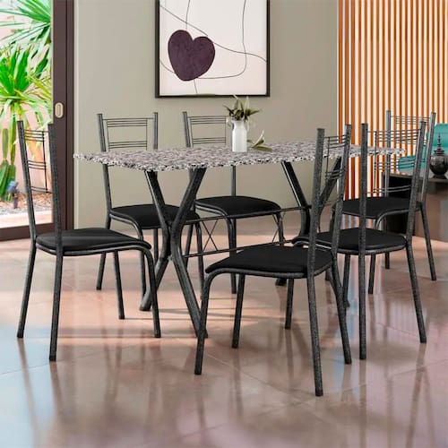 Sua casa ainda mais organizada Contendo 6 cadeiras e base da mesa produzidos em tubo de aço-carbono com acabamento em pintura em pó eletrostática, e um tampo em granito, muito resistente. Material de fácil higienização, além de combinar com diversos ambiente.