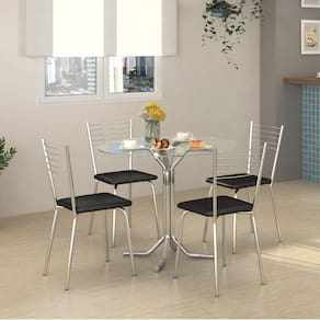 A Mesa braga possui o tampo em formato redondo, constituído de vidro incolor e acabamento lapidado, resistente e prático para limpar. Sua transparência deixa o espaço elegante. Sua estrutura é cromada, processo que dá brilho permanente aos tubos de aço, oferece ainda mais elegância para seu ambiente. A cadeira Flex tem um design moderno que combina facilmente com qualquer ambiente, é empilhável, o que possibilita ganho de espaço na residência. Seu assento é revestido por Napa, tecido de alta tecnologia com característica similar ao couro e efeito elástico, mais econômico, possui aspecto macio, quase liso, sendo extremamente versátil e fácil de limpar. Medida da Mesa (A x L x P): 73x90x90cm Peso da Mesa: 4 kg Mesa suporta até: 60.0000 Acabamento da Cadeira/Banco: Cromado Acabamento da Mesa: Cromado Almofada do assento: Fixa Altura do Conjunto: 82 cm Ambiente Principal: Cozinha Cadeira/Banco estofada: Sim Cadeira/Banco suporta até: 120.0000 codigo_ean: 7909903198452 Cor: Cromado/Preto Cor do Produto: Cromado/Preto Enchimento do Assento: Espuma D-23 Escala de Brilho: Brilhante Espessura do Tampo: 6 mm Estrutura do Assento: MDF Itens Inclusos: 1 Mesa, 4 Cadeiras, Kit Ferragens e Manual de Montagem Linha ou Coleção: Braga Manual de Montagem e Instalação: https://product-hub-prd.madeiramadeira.com.br/509188/documents/38b95e19-6abc-4216-b1fe-193a09f7a50eldemontagemdamesabragap406.pdf Material da Base da Mesa: Aço Material da Estrutura da Cadeira: Aço Carbono Material do Tampo: Vidro Medida da Base (A x L x P): 62x73x62cm Medida da Cadeira/Banco (A x L x P): 82x38x39cm Medida do Tampo (L x C x E): 90x90x0,6cm Necessita Montagem: Não Origem do Produto: Nacional Peso da Cadeira/Banco: 3,5 kg Possui Apoio Para os Pés: Não Quantidade de Cadeiras: 4 Quantidade de Lugares: 04 Recomendações de Uso, Manutenção e Limpeza: Utilizar um pano levemente úmido Revestimento da Cadeira/Banco: Couro Ecológico Vidro Temperado: Não Ean: 7909903198452