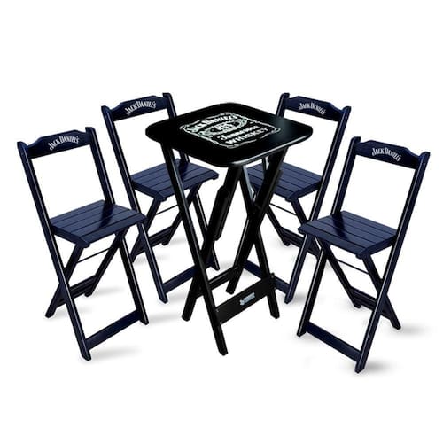O Conjunto Jack Daniel?s é ideal para bares, restaurantes, estabelecimentos, áreas de lazer e também para sua casa. Em madeira maciça, tornando-os resistentes e duráveis. Seu design permite que esse conjunto seja encaixado em qualquer ambiente, trazendo um toque a mais para seu estabelecimento. Além de sua durabilidade, o que lhe trará conforto para servir seus clientes. Por ser dobrável torna-se mais fácil guardar, manusear e limpar o produto.
