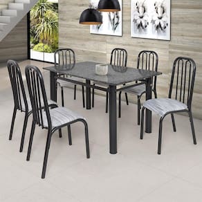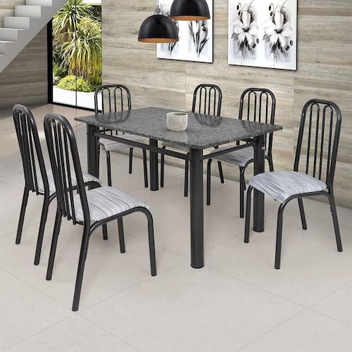 O conjunto de mesa de granito com 6 cadeiras Ciplafe é fundamental e combina com qualquer sala de jantar. Além de promover um ótimo espaço em sua casa, ela é ideal para reunir os amigos e familiares para qualquer tipo de comemoração. Essa mesa 6 cadeiras possui uma armação de tubo de aço com tratamento anticorrosão resistente e fácil de limpar, facilitando seu dia a dia. A pintura em epoxi eletrostática em pó deixa a mesa de cozinha 6 cadeiras firme e segura contra os efeitos corrosivos. Essa mesa 6 lugares possui uma base própria para adaptar a pedra em granito como tampo. Esse conjunto de mesa vem acompanhado de 6 cadeiras que acompanham o mesmo design da base. Essas cadeiras também são feitas em aço com tratamento anticorrosão 8S capaz de proporcionar maior resistência e durabilidade ao produto. Os assentos são revestidos com courino e espuma, trazendo a sensação de conforto ao sentar-se e a facilidade na higienização do produto. Tudo isso faz dessa mesa de granito 6 cadeiras o produto certo para compor a sua casa. Aproveite!