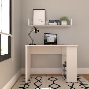Com um design moderno e funcional, essa mesa oferece espaço amplo para seu laptop, cadernos e canecas de café, além de prateleiras práticas para manter tudo organizado. A superfície de trabalho é resistente e fácil de limpar, perfeita para enfrentar a rotina diária sem perder o charme. Completa o conjunto uma prateleira versátil que combina perfeitamente com a mesa. Feita para exibir seus livros favoritos, plantas decorativas e, claro, aquele troféu especial. Com um acabamento elegante, a prateleira é o toque final que deixa seu espaço com a sua cara. Invista em conforto e estilo com esse conjunto! Acabamento do Tampo: Melamínico Acabamento dos Pés: Melamínico Acompanha Manual de Instalação: Sim Ambiente Principal: Escritório Complexidade da Montagem: Alta: deve ser montado por um montador especializado Cor: Branco Cor da Base: Branco Cor do Produto: Branco Cor do Tampo: Branco Cor Interna: Branco Dobrável: Não Escala de Brilho: Fosco Espessura do Tampo: 25 mm Formato: Retangular Itens Inclusos: Mesa, Prateleira, Ferragens e Manual de Montagem Linha ou Coleção: Kit Cubos Manual de Montagem e Instalação: https://cdn2.madeiramadeira.com.br/atributo/bramov-moveis/2084156-5228-17193390181716.pdf Material da Estrutura: MDF/MDP Material do Tampo: MDF/MDP Material dos Pés: MDP Material Principal: MDF/MDP Necessita Montagem: Sim Origem do Produto: Nacional Pés com Regulagem de Altura: Não Pés Reguláveis: Não Peso: 20 kg Peso Máximo por Prateleira: 3 kg Possui Painel: Não Possui Painel de TV: Não Possui Passa Cabos: Não Possui Porta Objetos: Não Possui Prateleiras: Sim Possui suporte para CPU: Não Possui Suporte para Teclado: Não Possui Vidro: Não Quantidade de Prateleiras: 04 Prateleiras Recomendações de Uso, Manutenção e Limpeza: Limpar apenas com pano macio levemente umidecido. Sapatas Niveladoras: Sim Sistema de Montagem: Parafusos, cavilha e minifix. Suporta Até (kg): 35 kg