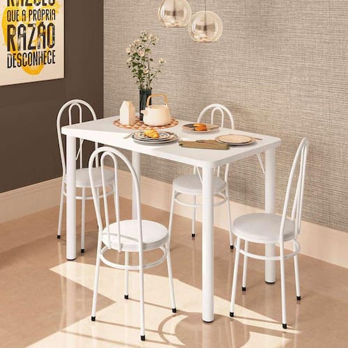 que tal o conjunto roma? reunir as pessoas que amamos é um momento que deve ser aproveitado segundo por segundo, não é mesmo? ainda mais enquanto estamos jogando conversa fora e desfrutando de uma boa refeição. o conjunto roma, nbsp;além da mesa com acabamento em epóxi, ainda tem nbsp;4 cadeiras estofadas em tecido corino nbsp;para garantir elegância à sua refeição.