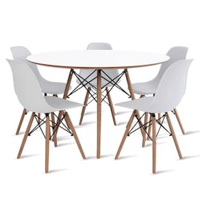 Conjunto de Mesa de Jantar Eames Eiffel Redonda 100cm Tampo de Madeira Branco com 5 Cadeiras Brancas - Mostarda