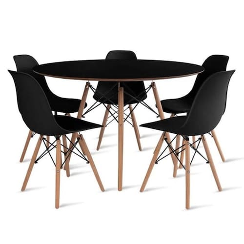 Conjunto de Mesa de Jantar Eames Eiffel Redonda 120cm Tampo de Madeira Preto com 5 Cadeiras PretasO Jogo de Mesa 5 Cadeiras Eames Eiffel se destaca pelo design moderno e sofisticado. A Cadeira Eames é confeccionada em policarbonato, sua base é em Madeira maciça, o que confere total resistência e conforto, o tampo da mesa é confeccionado em MDF com pintura impermeável garantindo melhor durabilidade ao produto, sua base é em Madeira maciça. O Jogo de Mesa 5 Cadeiras Eames Eiffel da vida ao ambiente além de combinar com todos os tipos e cores de móveis.Tipo: ConjuntoModelo: Eames EiffelDimensões do Produto:CadeiraCor: PretaAltura: 85cmLargura: 47cmProfundidade: 50cmAssento x Chão: 45cmContém: 5 cadeirasPeso máximo suportado: 120kgMesaCor: PretaAltura: 76cmDiâmetro: 120cmObs: Imagens Meramente Ilustrativa