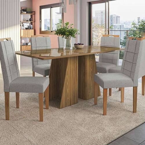 que tal o conjunto de mesa e cadeiras trevie? uma casa aconchegante precisa de uma sala de jantar bem equa, não é mesmo? e nada hor do que o conjunto trevie para receber seus convidados nas ocasiões especiais ou reunir a família. unindo uma mesa com tampo de vidro e 6 cadeiras estofadas em espuma, o kit oferece o espaço perfeito para acomodar tudo na hora de servir e ainda promove mais bem-estar a todos, seja no café da manhã, almoço ou jantar. além da usabilidade, o design moderno e sofisticado dá um ar elegante à decoração e torna fácil fazer a combinação com todos os outros móveis da casa. tudo perfeito para seu cantinho :)