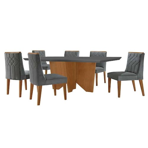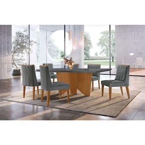 que tal o conjunto de mesa e cadeiras varsóvia? conquistar sua sala de jantar dos sonhos vai ficar fácil com o conjunto varsóvia. completo para o dia a dia, o kit une mesa espaçosa e cadeiras aconchegantes, tudo para promover o bem-estar necessário às refeições em família ou com amigos. além de muita funcionalidade, você também leva um design elegante e contemporâneo para o seu cantinho, graças à valorização do tom neutro e do acabamento amadeirado. ah, notou que a mesa tem aplicação de vidro no tampo? um charme extra para sua casa que ainda facilita a limpeza :) Marca: Modern Ean: 7908560535716