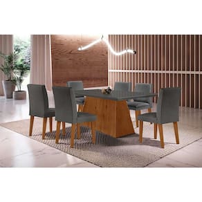 que tal o conjunto de mesa luna com cadeiras grécia? conquistar sua sala de jantar dos sonhos vai ficar fácil com o conjunto luna e grécia. completo para o dia a dia, o kit une mesa espaçosa e cadeiras aconchegantes, tudo para promover o bem-estar necessário às refeições em família ou com amigos. além de muita funcionalidade, você também leva um design elegante e contemporâneo para o seu cantinho, graças à valorização do tom neutro e do acabamento amadeirado. ah, notou que a mesa tem aplicação de vidro no tampo? um charme extra para sua casa que ainda facilita a limpeza :) Marca: Modern Ean: 7908560531312