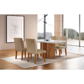 que tal o conjunto de mesa berlim com cadeiras grécia? conquistar sua sala de jantar dos sonhos vai ficar fácil com o conjunto berlim e grécia. completo para o dia a dia, o kit une mesa espaçosa e cadeiras aconchegantes, tudo para promover o bem-estar necessário às refeições em família ou com amigos. além de muita funcionalidade, você também leva um design elegante e contemporâneo para o seu cantinho, graças à valorização do tom neutro e do acabamento amadeirado. ah, notou que a mesa tem aplicação de vidro no tampo? um charme extra para sua casa que ainda facilita a limpeza :)
