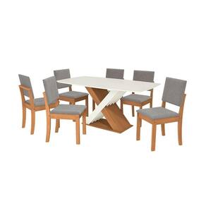 Conjunto de Mesa de Jantar Retangular com Tampo de Vidro Off White Graviola e 6 Cadeiras Luna Bouclé Cinza e Canela - Marrom