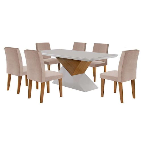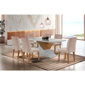 que tal o conjunto de mesa turmalina com cadeiras grécia? conquistar sua sala de jantar dos sonhos vai ficar fácil com o conjunto turmalina e grécia. completo para o dia a dia, o kit une mesa espaçosa e cadeiras aconchegantes, tudo para promover o bem-estar necessário às refeições em família ou com amigos. além de muita funcionalidade, você também leva um design elegante e contemporâneo para o seu cantinho, graças à valorização do tom neutro e do acabamento amadeirado. ah, notou que a mesa tem aplicação de vidro no tampo? um charme extra para sua casa que ainda facilita a limpeza :) Marca: Modern Ean: 7908560504521