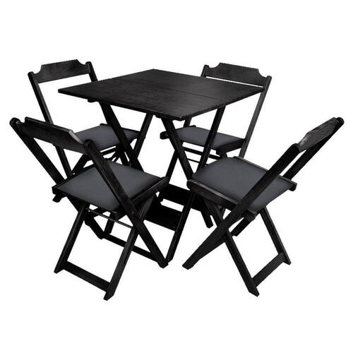Conjunto De Mesa Dobravel De Madeira 60x60 Com 4 Cadeiras Preto Estofado PretoTenha um pacote completo de praticidade e conforto com este conjunto, ideal para restaurantes, bares, estabelecimentos comerciais, áreas de lazer ou até mesmo para sua casa. Feito em madeira maciça, resistente e durável. Seu design permite que seja encaixado em vários ambientes trazendo um toque estético a mais ao mesmo. Além de estética, este conjunto de mesas e cadeiras também garante praticidade de locomoção dos produtos, longa durabilidade e estofamento confortável.ATENçãO: EVITE USAR PRODUTOS ABRASIVOS E QUíMICOS PARA LIMPEZA DO PRODUTO, aconselha-se o uso de pano umedecido para melhor conservação; mantenha o produto fora de chuva e sol constantes.Matéria prima:Madeira Maciça, de alta densidade e resistente.Sua variação de tonalidades é uma característica típica desta madeira, podendo apresentar diversos tons num mesmo produto em harmonia com o brilho do verniz.Modelo: DobrávelCor: Preto c/ PretoDimensões (Mesa): Altura 90cm / Largura 60cm / Profundidade 60cm Dimensões (Cadeiras): Altura 88cm / Largura 43cm / Profundidade 33cmConjunto de Mesa Dobravel de Madeira 60x60 com 4 Cadeiras Preto Estofado Preto