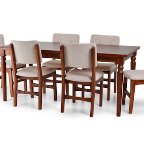 Um Conjunto de Mesa Sabrina Retangular com 6 Cadeiras de Madeira é a escolha perfeita para quem busca combinar elegância, conforto e durabilidade na sala de jantar ou em um espaço gourmet. Possui um formato retangular, ideal para acomodar confortavelmente até seis pessoas. Medida da Mesa (A x L x P): 78X91x182 Peso da Mesa: 34,01 kg Mesa suporta até: 40 kg Acabamento da Cadeira/Banco: Pintura Acabamento da Mesa: Verniz Almofada do assento: Fixa Ambiente Principal: Sala de Jantar Cadeira/Banco estofada: Encosto e Assento Estofados Cadeira/Banco Estofada: Encosto e Assento Estofados Cadeira/Banco suporta até: 90 kg codigo_ean: 7900288175991 Complexidade da Montagem: Baixa: pode ser montado por uma pessoa sozinha Cor: Nozes Cor do Produto: Nozes Escala de Brilho: Fosco Espessura do Tampo: 130 mm Itens Inclusos: 1 Mesa, 6 Cadeiras, Ferragens e Manual de Montagem Linha ou Coleção: Sabrina Manual de Montagem e Instalação: https://product-hub-prd.madeiramadeira.com.br/123460744/documents/9bc3e438-d031-4618-8e26-240ce89972ae2976517154117490629771486.pdf Marca: Móveis Deiss Material da Base da Mesa: Madeira Maciça Material da Estrutura da Cadeira: Madeira Maciça Material do Tampo: Madeira Maciça Medida da Cadeira/Banco (A x L x P): 90x46,5x53 Medida do Tampo (L x C x E): 91X182X13 Necessita Montagem: Sim Origem do Produto: Nacional Peso da Cadeira/Banco: 15,76 kg Possui Apoio Para os Pés: Sim Possui Vidro: Não Quantidade de Cadeiras: 6 Quantidade de Lugares: 06 Recomendações de Uso, Manutenção e Limpeza: Pano úmido Sistema de Montagem: Parafusos Tipo de Assento: Fixo Tipo de Encosto: Estofado Tipo de Madeira Maciça da Base da Mesa: Eucalipto Tipo de Madeira Maciça do Tampo: Eucalipto Marca: Não Informado