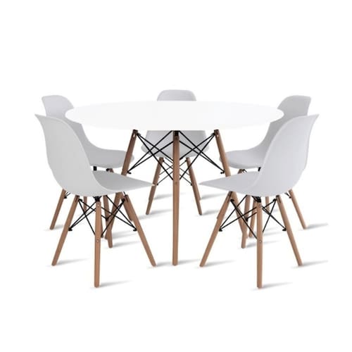 O Conjunto de Mesa de Jantar Eames Eiffel é a combinação perfeita de elegância e funcionalidade. Com uma mesa redonda de 120cm de diâmetro e tampo em MDF branco, ele traz um toque de sofisticação e luminosidade para sua sala de jantar. A base da mesa e das 5 cadeiras Eiffel são em madeira maciça, garantindo durabilidade e resistência. As cadeiras, com assento em polipropileno, oferecem conforto e um design atemporal que se adapta facilmente a qualquer ambiente.