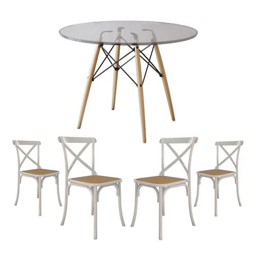 Conjunto De Mesa Eiffel Redondo Tampo De Vidro 110cm Com 4 Cadeiras Katrina em Aço Branca Assento BegeA sua cozinha ou sala de jantar ficará completa com esse lindo Conjunto de Mesa e Cadeiras! Contendo um design de móveis moderno, elegante e com uma ousada combinação de cores, esse é um kit que certamente é uma solução que esbanja estilo, elegância e muito requinte.O conjunto tem em sua diversificada estrutura de materiais com altíssima qualidade, que proporciona muito mais resistência, mesmo com o passar dos anos, e com seus 4 assentos Katrina Aço é ideal para um jantar em família sem abrir mão do conforto. O Kit acompanha versatilidade e combina com vários tipos de decoração, o que dá mais praticidade em sua casa.Informações técnicas Conjunto:Conteúdo da Embalagem: 01 Mesa e 04 Cadeiras (Embalados Separadamente).Instruções/Cuidados: Limpar com pano seco ou levemente umedecido com água.Necessita de Montagem? Sim.Mesa:Modelo: Eiffel WoodTipo: RedondaCor do tampo: VidroCor da base dos pés: Wood (Madeira)Material do tampo: Vidro TemperadoMaterial dos pés: MadeiraDimensões: Altura: 76 cm // Largura: 110 cm // Profundidade: 110 cmCadeiras:Modelo: KatrinaCor: Branca e BegeMaterial da estrutura: Aço com Pintura E-PoxMaterial do assento: Espuma D14 com Revestimento em Corano.Dimensões: Altura: 90 cm // Largura: 50 cm // Profundidade: 55 cmConjunto de Mesa Eiffel Redondo Tampo de Vidro 110cm com 4 Cadeiras Katrina Branca Assento Bege