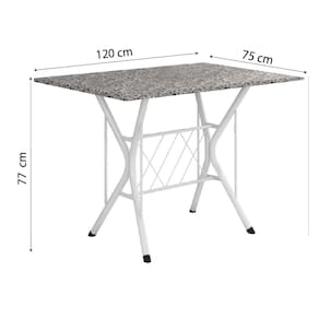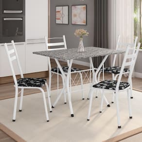 O Conjunto de Mesa Itália New com 4 lugares possui design moderno que se adapta a qualquer ambiente. Contém tampo retangular em granito resistente a altas temperaturas, e as cadeiras são revestidas em tecido corino de fácil limpeza. Ainda conta com base da mesa e cadeiras em aço, garantindo resistência e durabilidade.