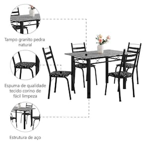 MEDIDAS MESA:: A: 77 cm L: 120 cm P: 75 cm | Medidas Cadeiras:: A: 95,5 cm L: 44,3 cm P: 40 cm | PESO MESA:: 65,74kg | PESO CADEIRA:: 6,36 Kg cada | PESO SUPORTADO MESA:: 100kg | PESO SUPORTADO CADEIRA:: 110 kg | MODELO:: Conjunto de Mesa Itália 1,20m com 4 Cadeiras | MARCA:: Artefamol | COR DA MESA:: Estrutura: Preto/ Tampo: Granito | COR DA CADEIRA:: Estrutura: Preto/ Assento: Floral | ESTRUTURA:: Base e Cadeira de Aço | REVESTIMENTO INTERIOR CADEIRA:: Espuma D25 | GARANTIA:: 3 meses pelo fabricante | TECIDO DA CADEIRA:: Material sintético | ACABAMENTO:: Fosco | MATERIAL DO TAMPO:: Granito | ITENS INCLUSOS:: 1 mesa e 4 cadeiras | QUANTIDADE DE CAIXAS: 4 Cor: Preto Fosc