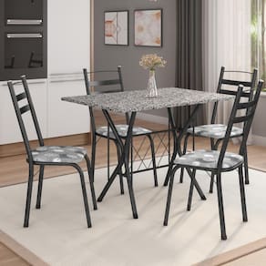 O Conjunto de Mesa Itália New com 4 lugares possui design moderno que se adapta a qualquer ambiente. Contém tampo retangular em granito resistente a altas temperaturas, e as cadeiras são revestidas em tecido corino de fácil limpeza. Ainda conta com base da mesa e cadeiras em aço, garantindo resistência e durabilidade.