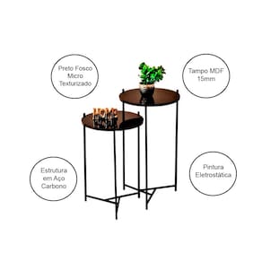 Tipo: Conjunto Mesa Lateral Modelo: Áquila Cor: Preto Estrutura em aço carbono 9.53mm Pintura eletrostática preto fosso micro texturizado de alta resistência Tampo em MDF 15mm pintura UV